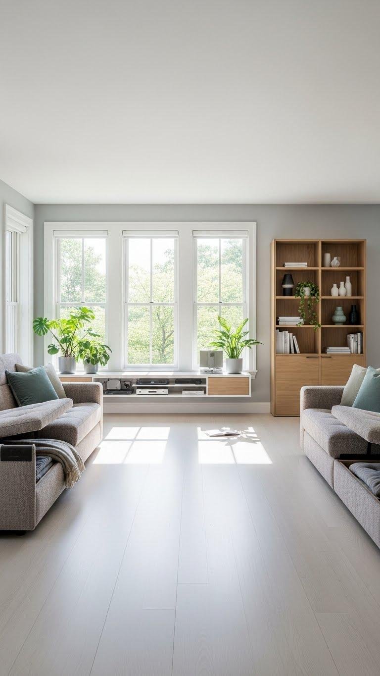 After choosing multifunctional pieces that tuck away clutter, keep the room feeling open by leaving the central floor clear. You’ll create clear pathways and intentional floor zoning that let light and air move freely.