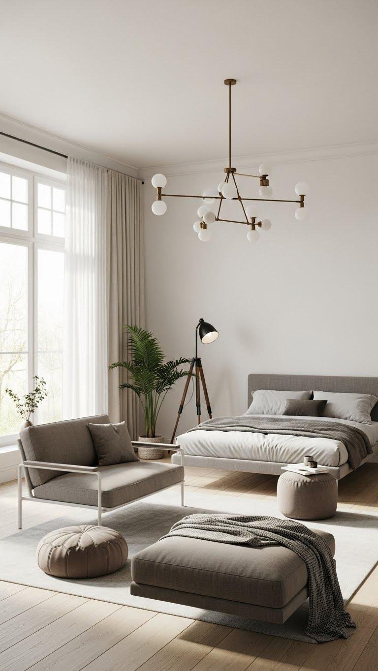 You’ll favor floating poufs and a slim chaise for flexible zones, tactile fabrics, and easy movement—choices that keep the bedroom airy, uncluttered, and freeing.