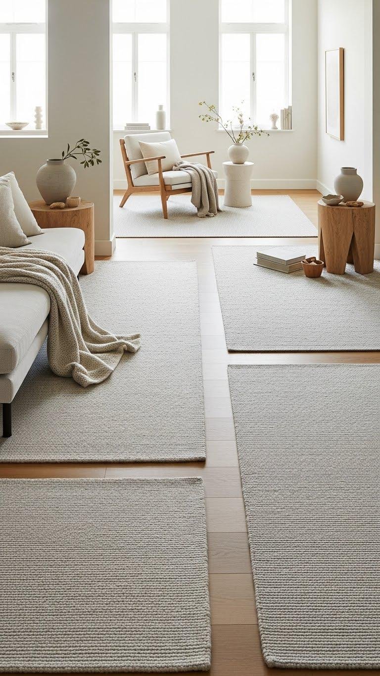 Anchor your spaces with low-pile, pale rugs to subtly define zones without weighing the room down. You’ll create gentle texture contrast that guides sight and step, keeping movement effortless. Choose soft neutrals and tactile weaves for sensory calm, then experiment with light rug layering to add depth without clutter. It feels airy, curated, and freeing—room that’s zoned, not boxed.