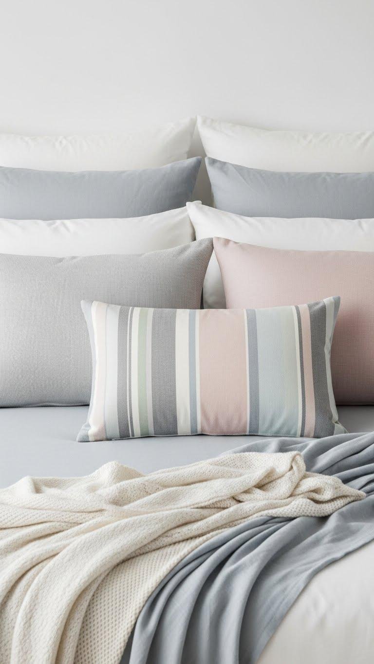 Pick a narrow, light palette for your pillows to keep the bed feeling calm and elevated—think off‑whites, pale greys, muted blushes, and whisper‑blue rather than a jumble of bold colors. You’ll mix subtle textures and controlled pattern mixing to add interest without clutter. Rotate pieces with seasonal rotation: swap linens and delicate throws to refresh the mood and maintain an airy, liberated vibe.