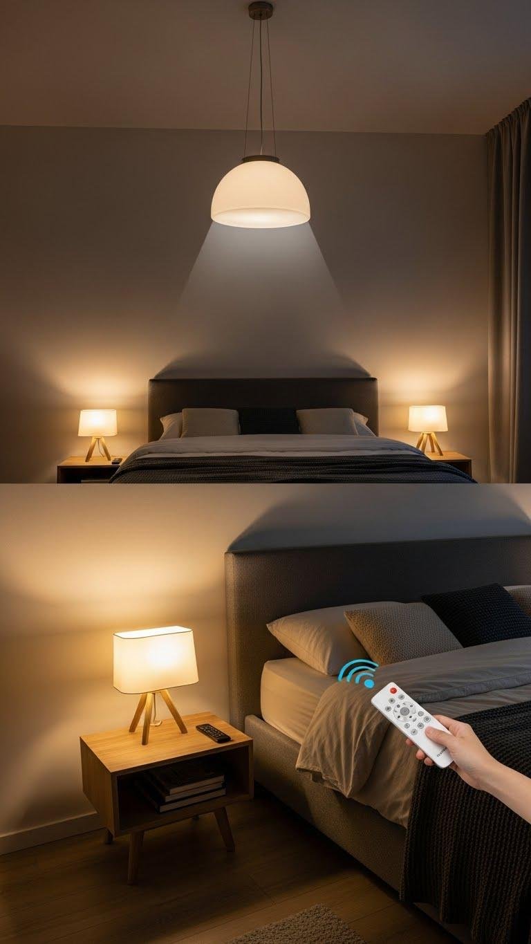 Choose a soft pendant for gentle overhead glow, add bedside lamps and floor lighting for texture, and use remote controls to shift scenes without leaving the bed.