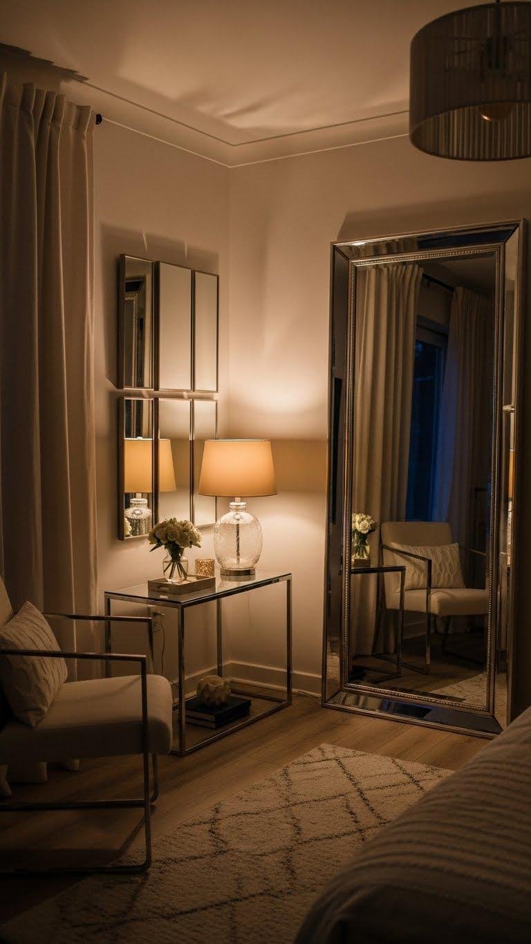 Soft pools of lamp light invite reflective surfaces to amplify and scatter brightness, so place mirrors and shiny accents where they catch and bounce that glow. You’ll lean into glossy accents and slim metallic frames to expand sightlines, create depth and lift mood.