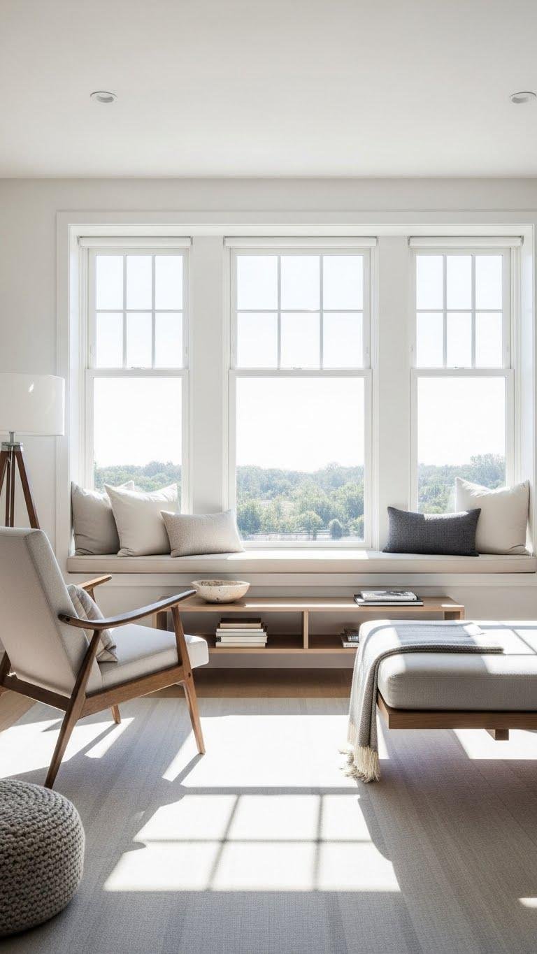 You’ll create liberated, breathable zones: offer window seating with crisp cushions, float an angled daybed to frame views, and let daylight sculpt texture and calm.