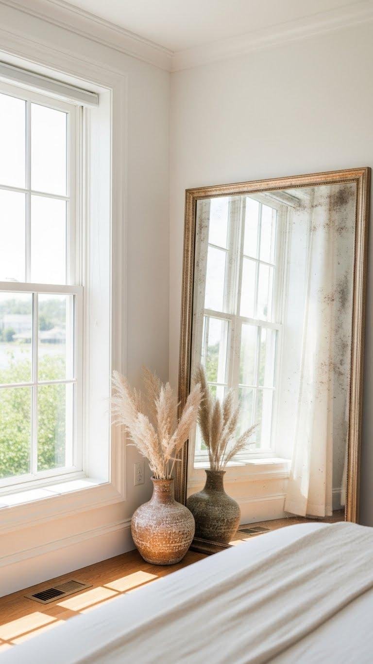When you hang a mirror opposite a window, it doubles daylight and deepens the view, making the room feel larger and fresher without adding clutter. Choose an antique mercury mirror for patina or a frameless accent for sleek reflection; both boost brightness, bounce breezes, and expand sightlines. You’ll feel liberated in a luminous, calm space that invites slow mornings and open evenings.