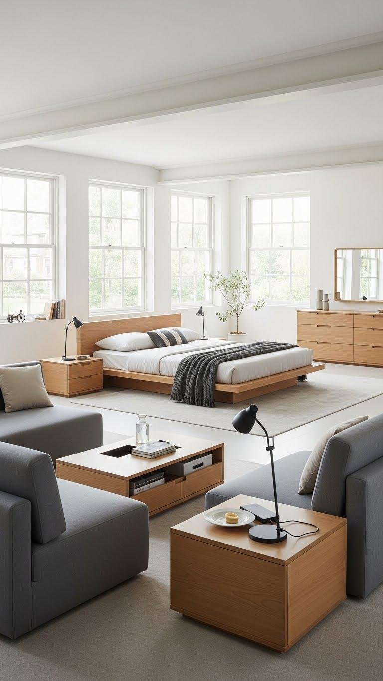 Lean into low-profile furniture to keep sightlines open and let light move across the room—beds with platform frames, short nightstands, and low dressers make ceilings feel higher and spaces airier. Choose pieces that sit close to the floor, pair modular seating for flexible lounging, and tuck belongings into recessed storage to keep surfaces minimal. You’ll breathe easier and move freely.