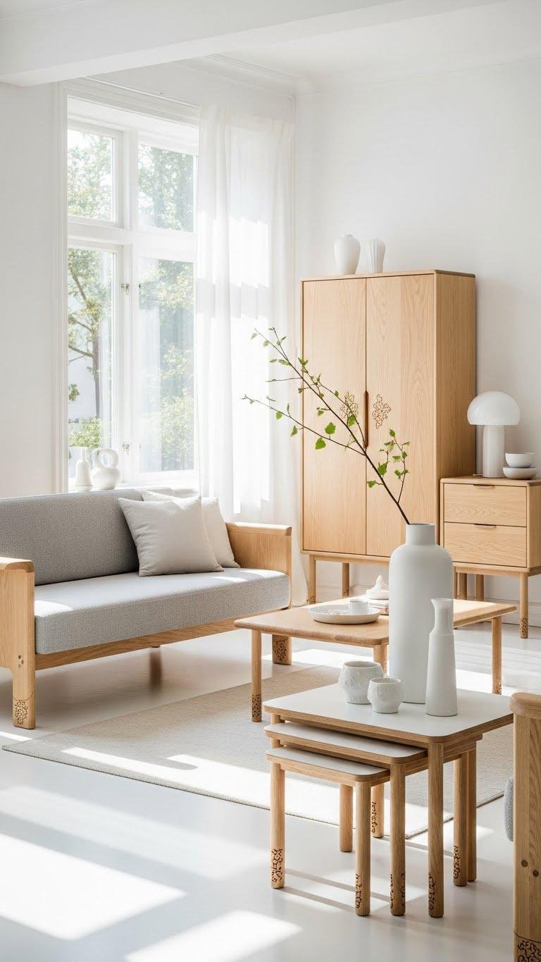 If you want the room to feel breezy and modern, pick light wood or painted white pieces that reflect light and calm the eye. You’ll create airy Scandinavian vibes with birch accents, pale oak tones, and matte white finishes. Choose streamlined silhouettes, tactile linens, and soft edges that invite movement and ease. The result feels open, restful, and quietly joyful.