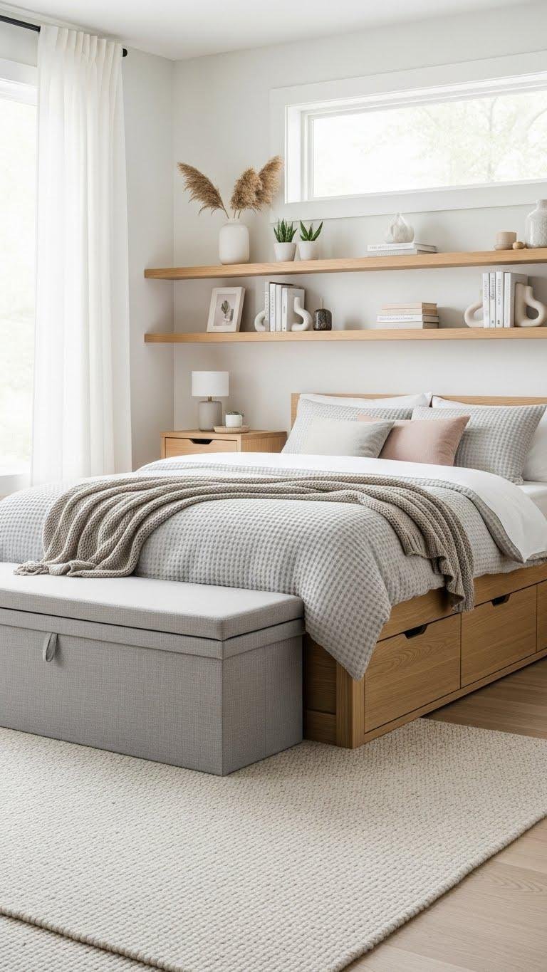 Because space should do double duty in an airy bedroom, choose storage that hides clutter while enhancing the room’s calm lines and tactile warmth. You’ll favor multifunctional pieces—seating with hidden nooks, beds with underbed drawers, and floating shelves that act as artful dividers.