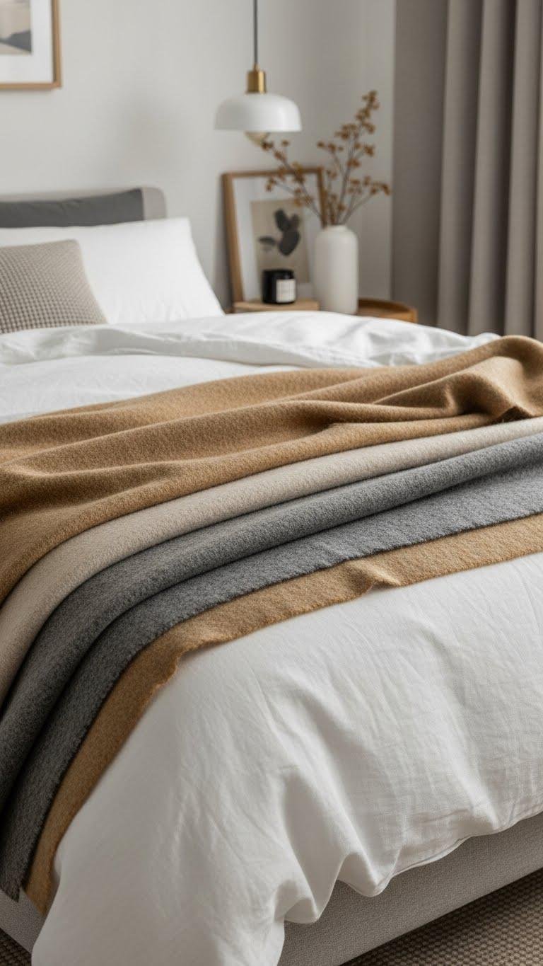 Layering wool blankets over crisp linen sheets gives your bed an inviting, lived-in look that’s equal parts cozy and chic.