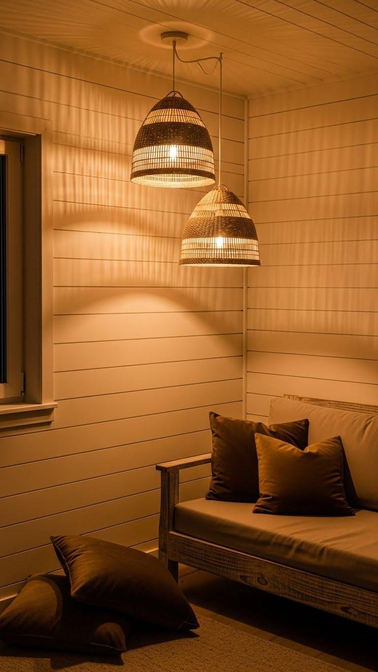 After the plush velvet and weathered wood set the mood, bring in shiplap walls and woven lampshades to warm the scene and add tactile contrast. You’ll lean into shiplap romance with horizontal lines that feel both clean and cozy. Pair with woven glow pendants that cast soft shadows, freeing your space from fuss and inviting relaxed, intimate evenings.