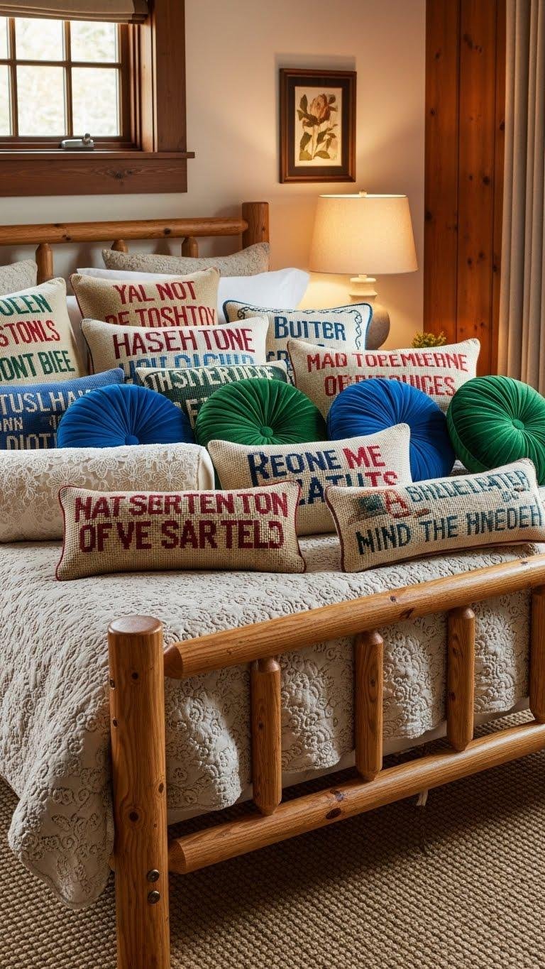 After you’ve soaked in cabin-core warmth, cheeky pillows bring a wink to a traditionally styled bedroom, turning formality into something playful without breaking the room’s refined rhythm. You’ll mix saucy needlepoint motifs with lace trimmed bolsters, balancing wit and heritage. Slip in velvet rounds or a cheeky embroidered lumbar, and let classic silhouettes loosen up, inviting bold comfort and liberated charm.