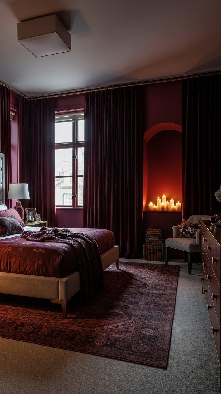 Moving from sunbaked terracotta to a richer palette, a Deep Burgundy Cocooned Bedroom wraps you in a velvety, enveloping warmth that feels both luxury-driven and quietly modern.