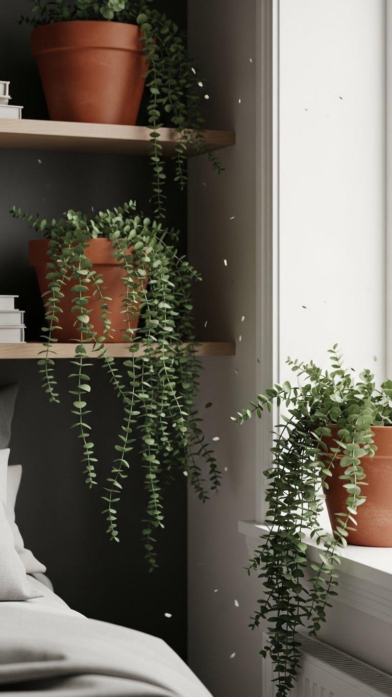 You’ll love hanging terracotta pots with trailing eucalyptus that spill over shelves or a window nook.