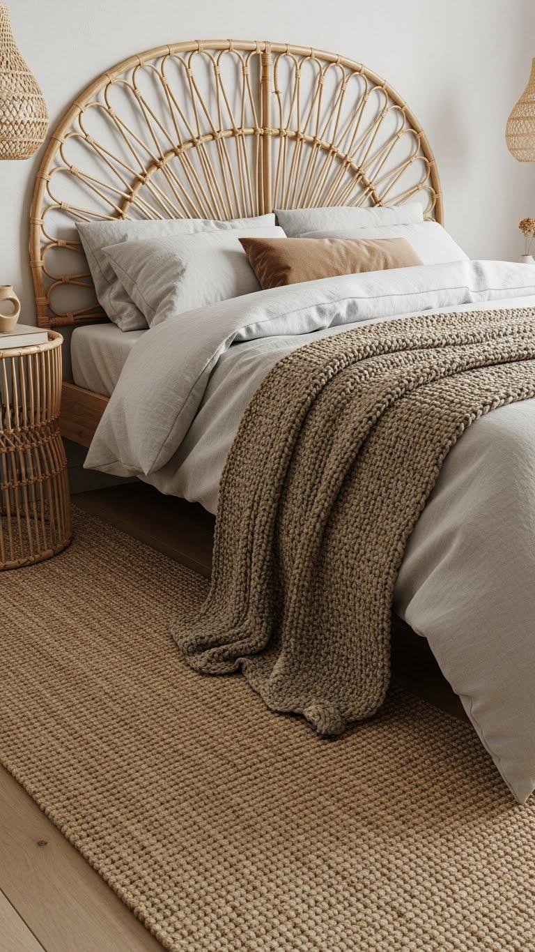 Layer a rattan headboard with linen sheets and a chunky knit throw to add warmth and texture. Anchor the bed with a jute runner or rug, keeping palettes sandy and muted so the space breathes and invites easy, unfussy comfort.