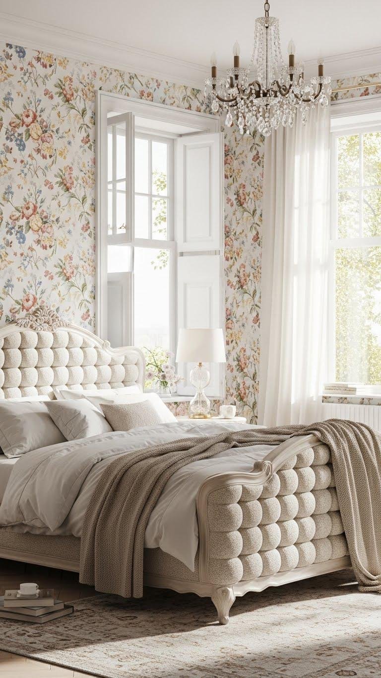 Floral Wallpaper With Off-White Bouclé Bedframe
