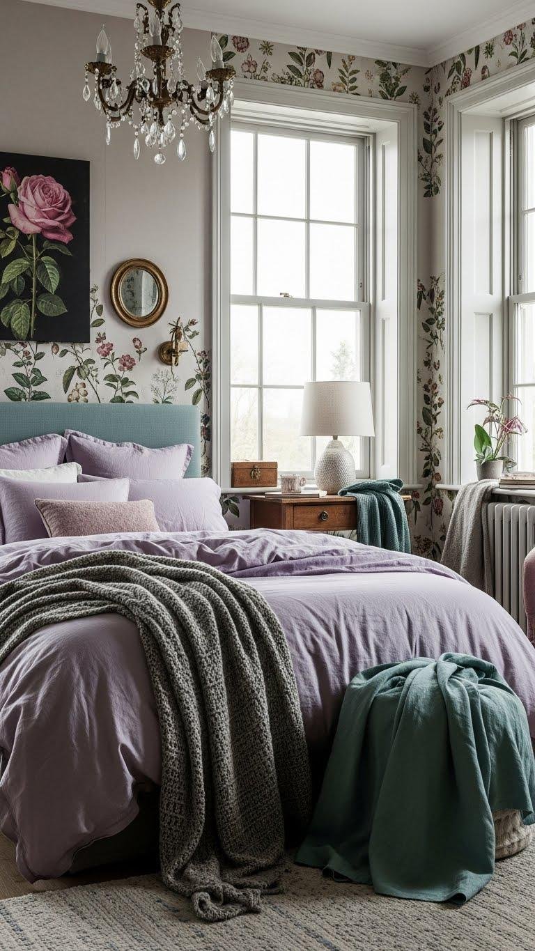 Though soft and understated, muted pastels with antique floral prints summon a quietly sophisticated romance that feels both curated and lived-in. You’ll layer muted lilac bedding, desaturated throws, and dusky mint accents against wallpaper of antique roses and vintage botanicals.