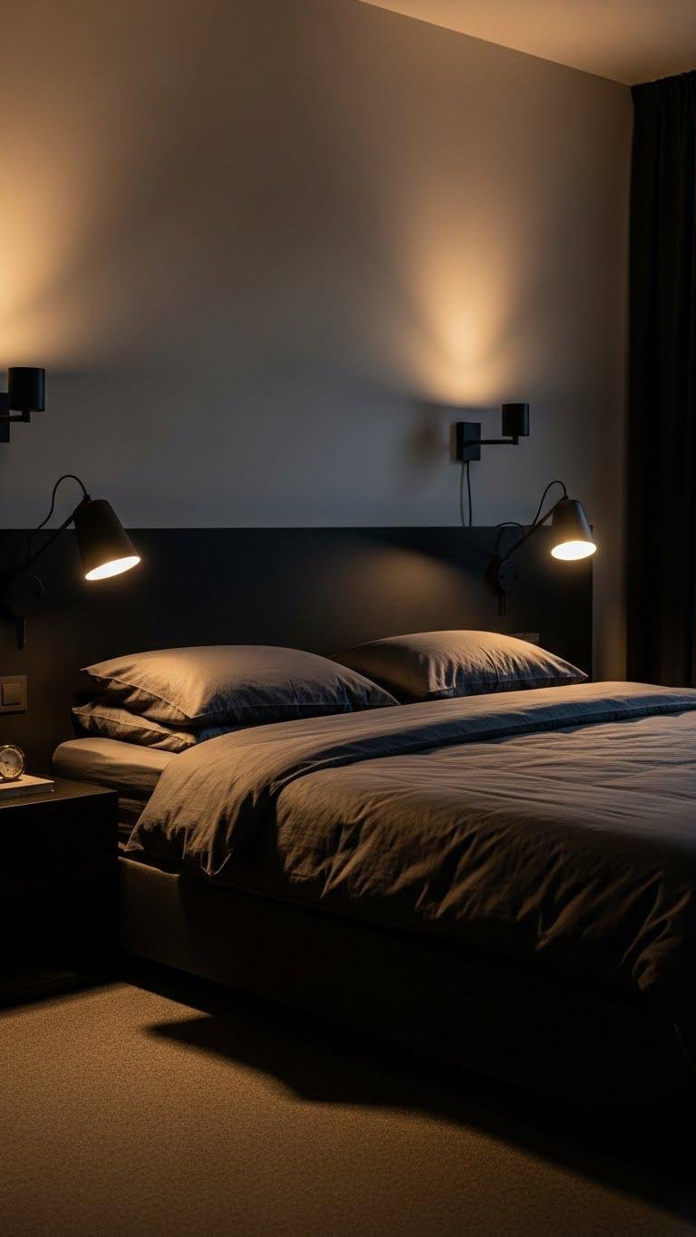 You’ll love matte black sconces casting warm pools over a charcoal duvet, highlighting crisp lines and soft shadows.