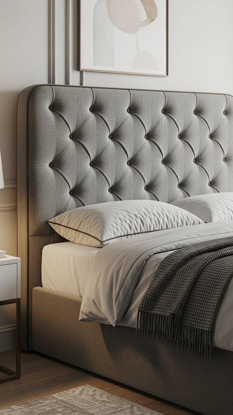Often a focal point, an upholstered headboard anchors your bed with soft form and tactile appeal—choose muted fabrics like boucle, washed linen, or velvet to keep the look calm and modern.