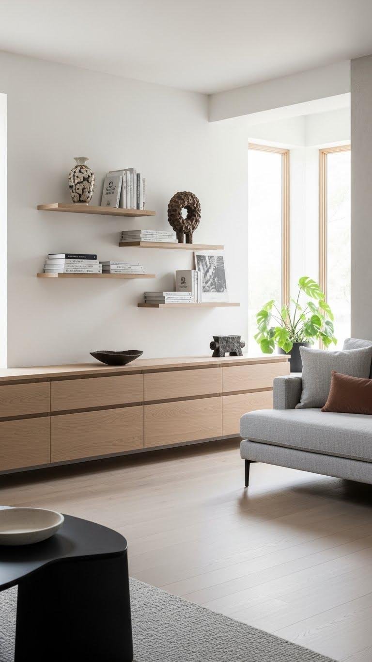While keeping surfaces uncluttered, built-in storage lets you design calm that actually functions; you get smooth, integrated cabinetry, floating shelves, and concealed drawers that hide clutter and highlight texture.