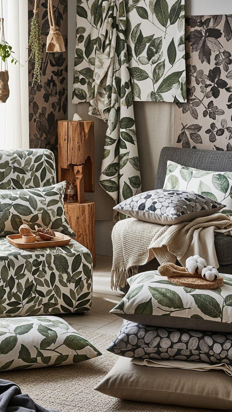 You’ll choose leaf pattern upholstery for a lived-in, free vibe and layer stone inspired textiles for grounding texture.