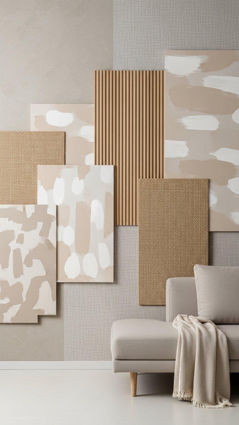 Anchor the room with a textured accent wall that speaks softly but unmistakably: think plastered limewash, fluted wood panels, or a tactile linen wallpaper in a warm neutral.
