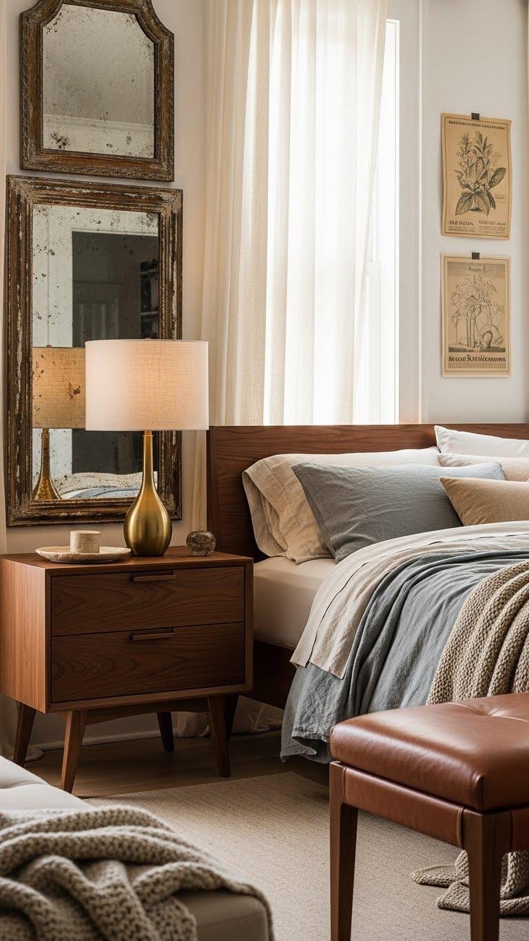 A well-chosen vintage piece can ground a calm bedroom without shouting for attention: pick a low-slung midcentury nightstand, a softened brass lamp, or a worn leather bench with a muted patina that feels lived-in, not cluttered. You’ll balance antique mirrors and muted brass with faded vintage posters, layer distressed linens for texture, and keep arrangements airy so the room breathes.