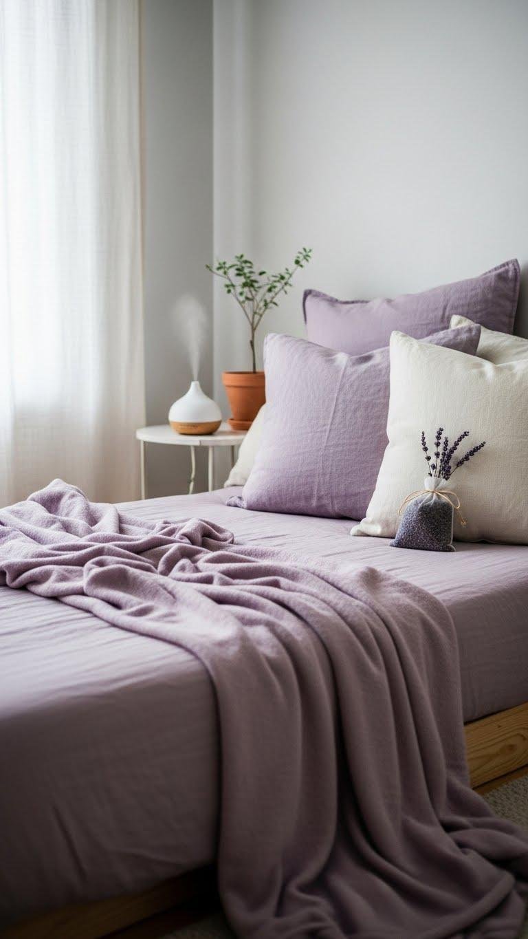 Because lavender calms both sight and scent, you can craft a small sleep nook that feels like a private lullaby: layer muted lilac textiles over a low bed or chaise, add a plush throw and linen pillows for cool, breathable texture, and place a compact diffuser or a sachet of dried blooms nearby to deepen the softness.