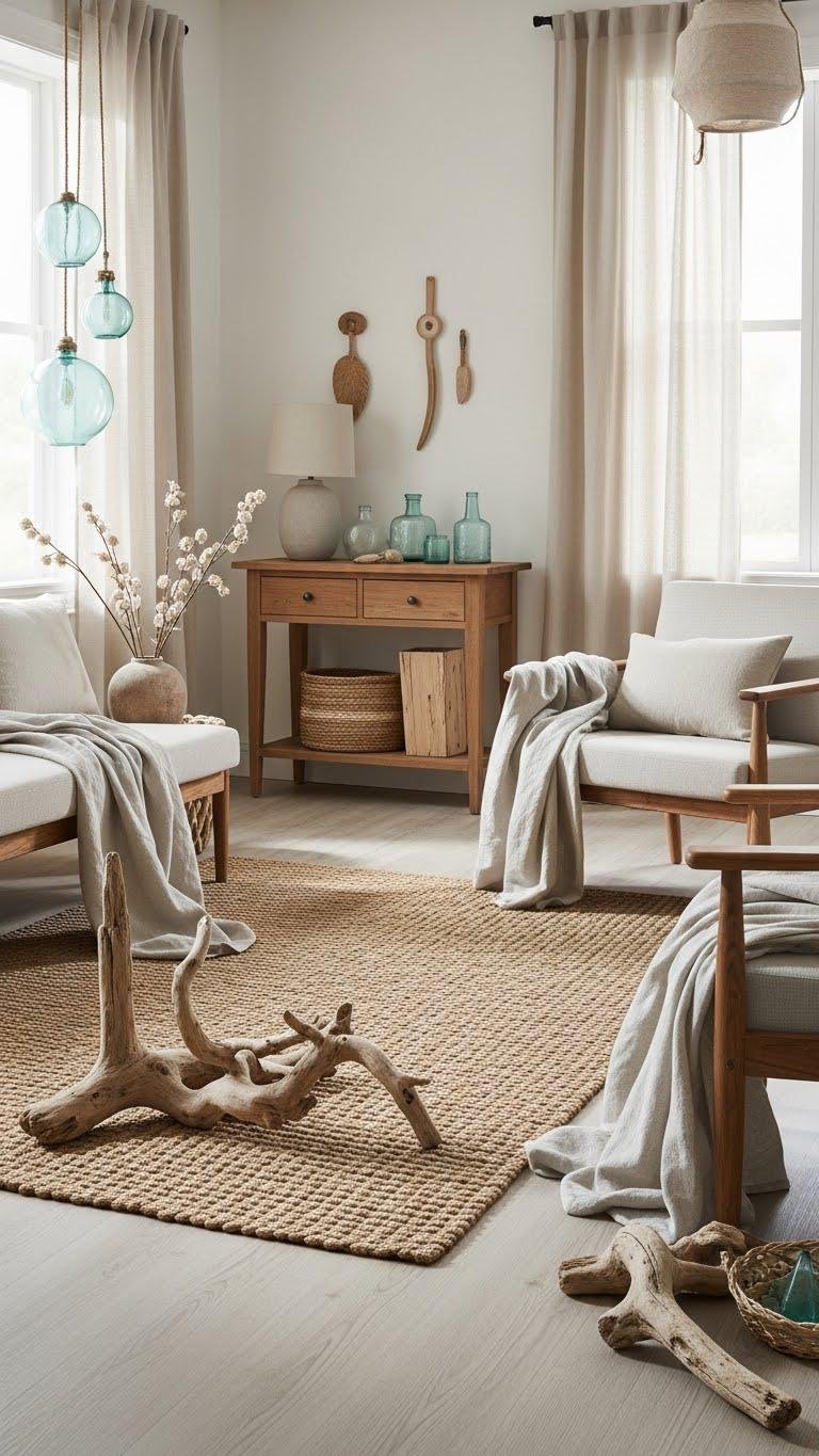 A woven jute rug and sun-bleached driftwood accents set the tone for a coastal neutrals scheme that feels airy and grounded at once.