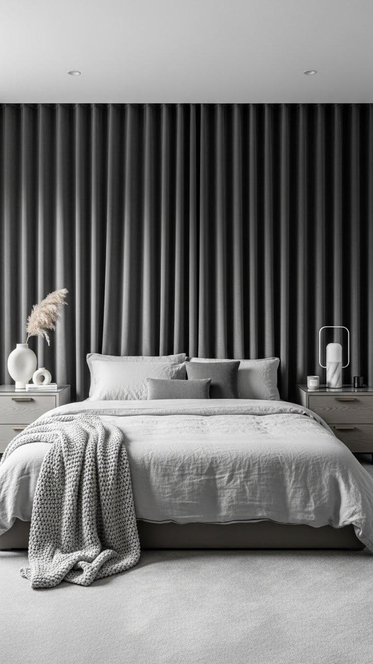 Shift the focus from a single-hue scheme to a soothing gray palette that still feels layered and alive. You’ll welcome muted charcoal accents, soft linen bedding, and velvety drapes that hush sound and light.