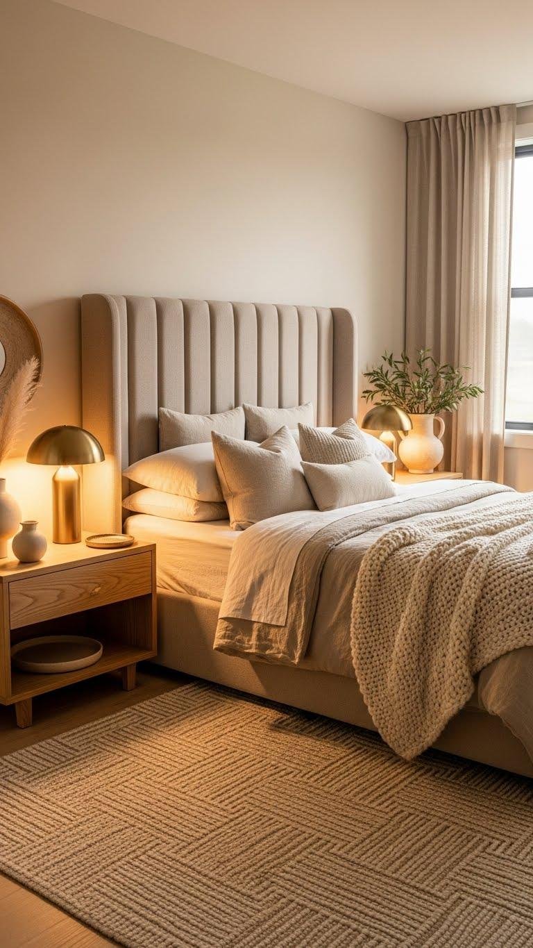 You choose tactile linens, low lighting, and natural wood to create shelter without confinement. A sculpted headboard and woven rug promise cozy napping. Minimal accents—beige ceramics, matte brass, and open air—keep the space breathable, modern, and quietly liberating.