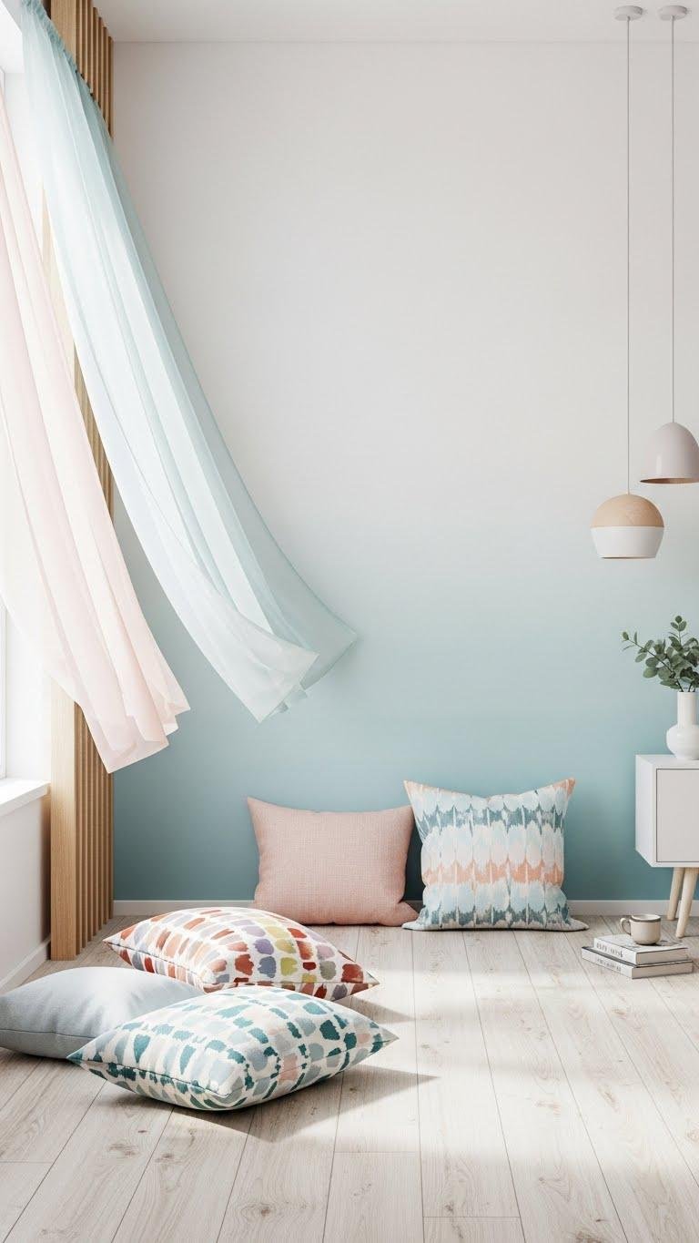 Light pastels wash the room in a soft hush, so you feel instantly calmer as mint, blush, and powder blue layer over crisp white and warm wood. You choose soft pastel accents, muted patterns on cushions, and gentle gradients on an accent wall. Airy fabrics flutter at the window, creating a liberated, calm retreat that’s modern, minimal, and quietly restorative.