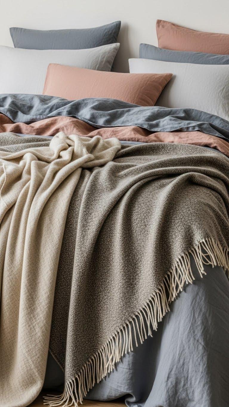 After soft pastels have set the mood, bring texture into the room with linen and wool layering to amplify that calm with tactile warmth. You’ll mix breathable fibers—linen sheets, wool throws—for contrast and ease.