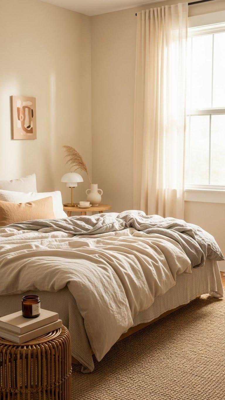 When you strip a bedroom down to essentials and layer soft neutrals, the space feels both calm and inviting; think warm beige walls, a low-profile bed dressed in textured linens, and a few well-chosen wooden or rattan accents. You’ll favor soft linen sheets, muted layers, and minimal decor that frees you to move, breathe, and rest without cluttered distraction.
