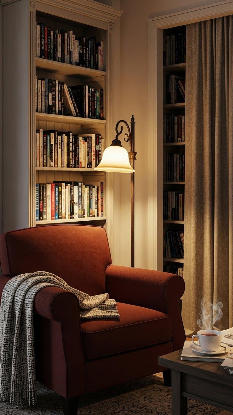 Think of a snug corner softened by a deep cherry accent—an upholstered armchair or painted bookshelf—that instantly draws you into reading mode. You’ll pair it with a warm vintage lampstand, textured throw, and a low table for tea.