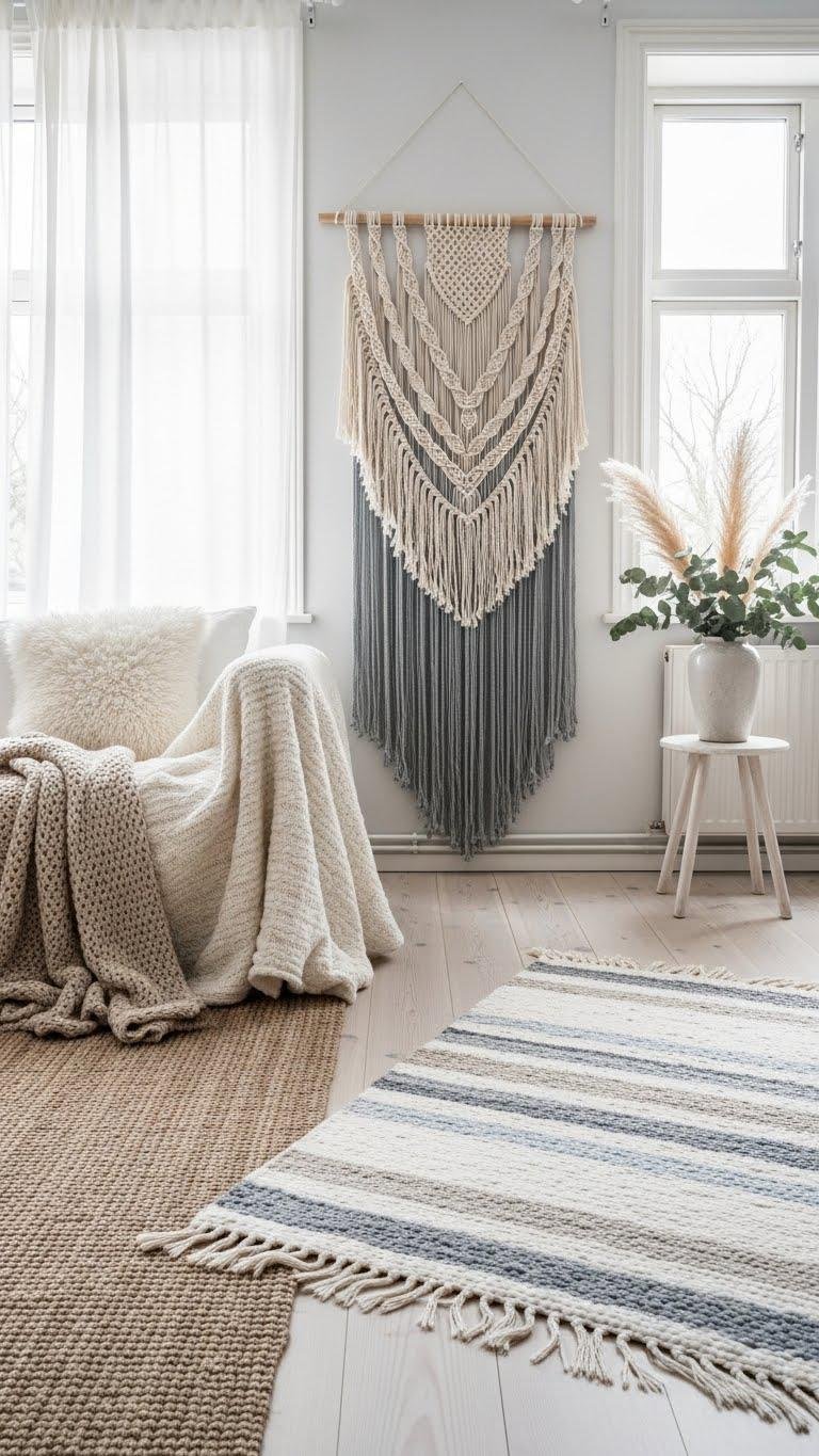 To bring warmth and tactile interest into that calm Scandinavian room, introduce woven wall hangings and layered textiles that catch the eye without cluttering the space. You’ll mix macramé gradients on a simple dowel with soft throws and rugs for tactile layering. Choose muted tones, natural fibers, and airy placement so pieces breathe — inviting comfort while keeping the room open and free.