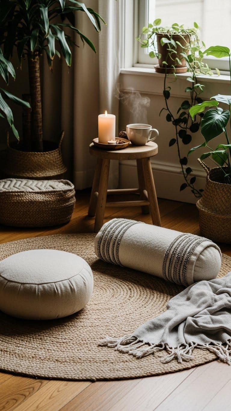 Carve out a low, grounding nook that invites you to sit and breathe: place a round jute mat or wool cushion on the floor, add a soft lumbar pillow and a lightweight throw, and keep nearby a small wooden stool for candles or a cup of tea.