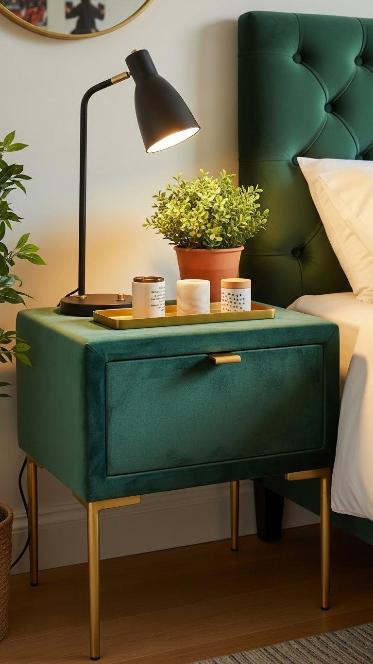 Bring a touch of luxe to your compact studio with a velvet and brass nightstand that balances soft texture and warm metal without feeling fussy.