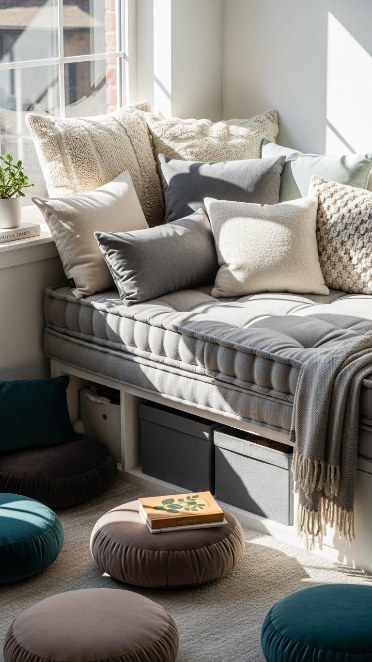 Tuck a plush window seat into your studio’s brightest corner to create a quiet nook for reading and daydreaming; layer a firm foam cushion wrapped in a soft cover, add a mix of lumbar and squishy pillows in varied sizes and textures, and finish with a lightweight throw for draping.