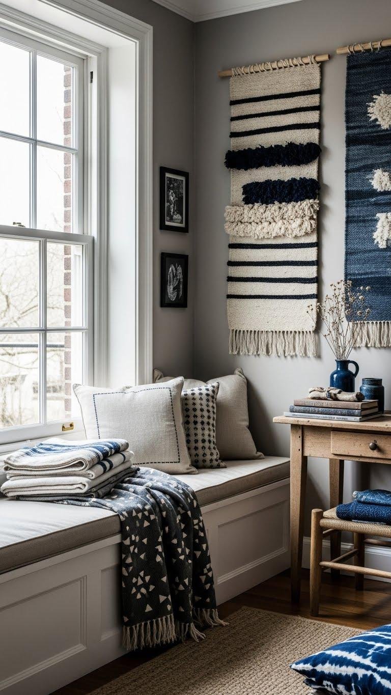 If your sunny window seat encourages quiet moments, carry that same handcrafted warmth into the rest of the studio with a vintage-inspired artisan textiles room.
