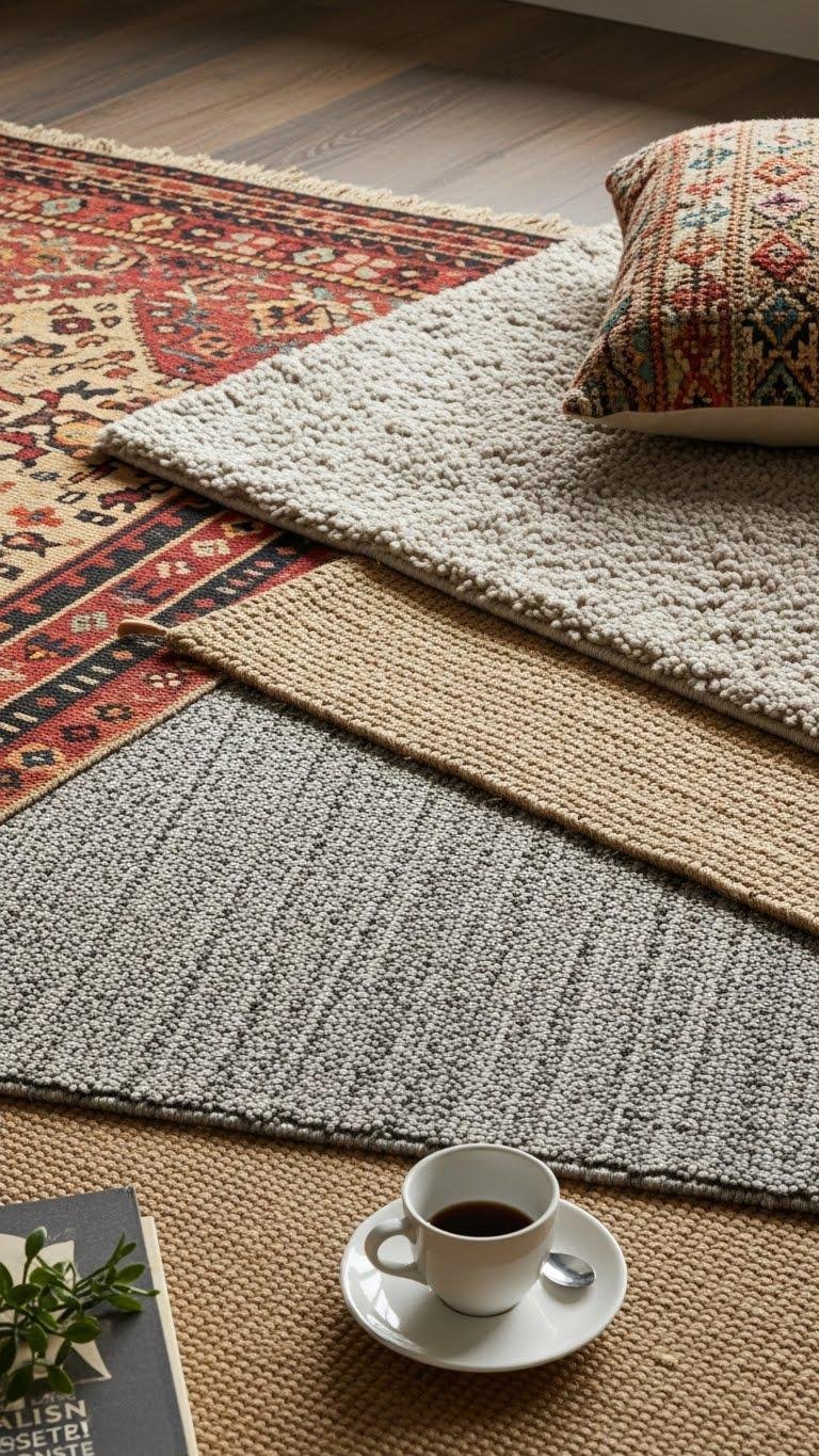 Use woven underlays for grip and shape, contrast flatweave with high-pile for layered textures, and let the floor express your easy, unconfined style.