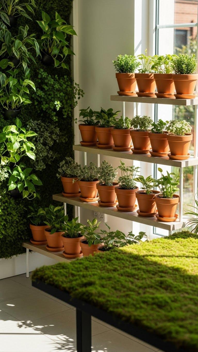 You’ll place a living wall for vertical drama, arrange terracotta planters on staggered shelves, and position a moss table beneath a sunlight cascade.