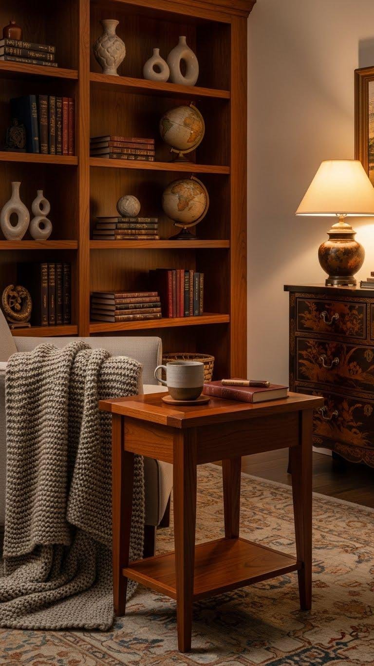 The glow from your dimmed lights will make cherry wood sing, so pair those warm lamps with cherry accent pieces to amplify the room’s cozy mood. You’ll place a polished cherrywood side table near a reading chair, balance it with open shelving, and let a vintage lacquer dresser anchor the corner.
