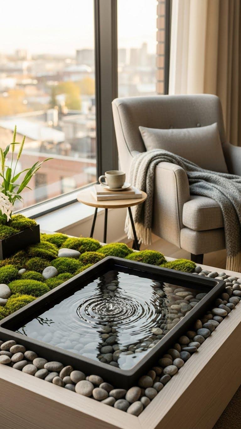If you want a calm corner that masks city noise, tuck a compact indoor water feature into a cozy nook and let its soft cascade set the room’s rhythm. You’ll position a low basin near a window, add a moss tableau and smooth stones, and arrange a seat. Watch the water ripple, breathe, and claim a small, freeing refuge from the rush.