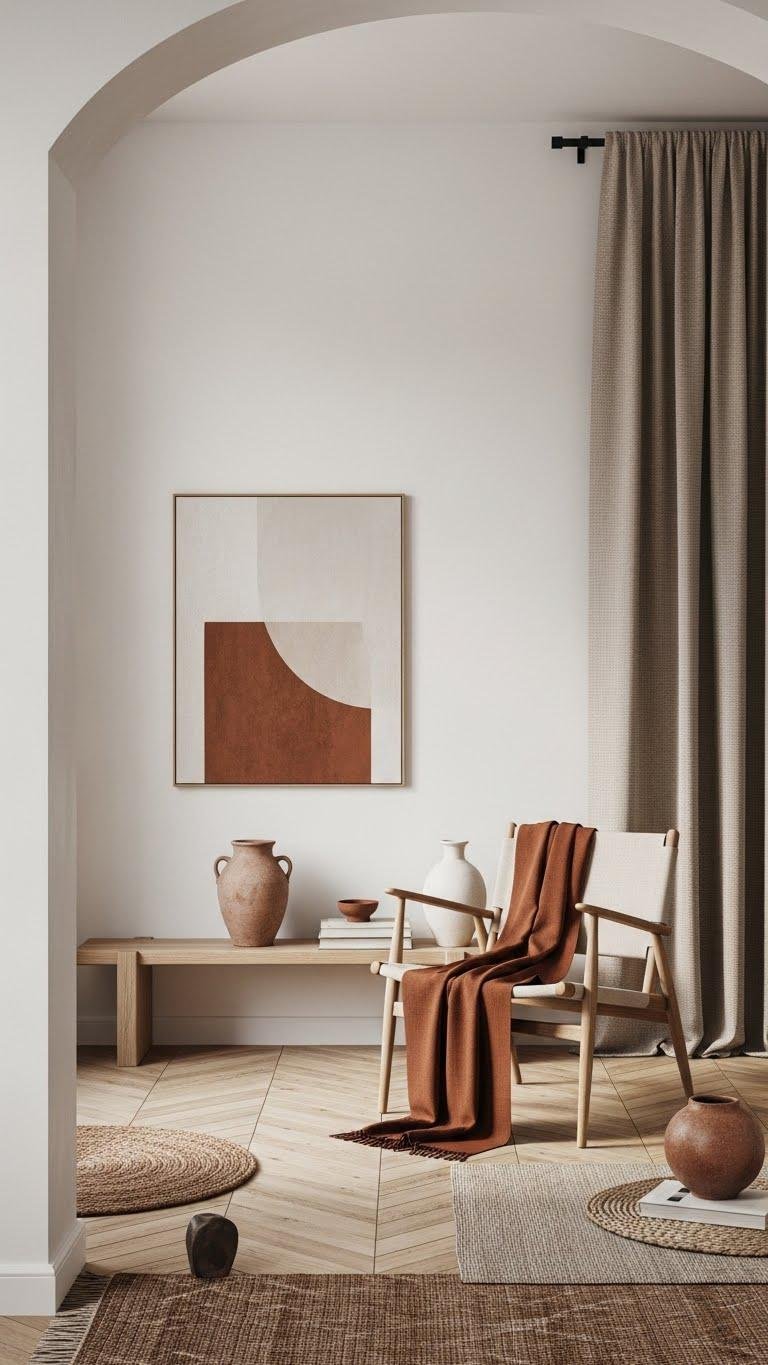 As you build a neutral base of warm whites, soft beiges, and muted greys, introduce rust and clay as deliberate accents to give the room character without overwhelming it.