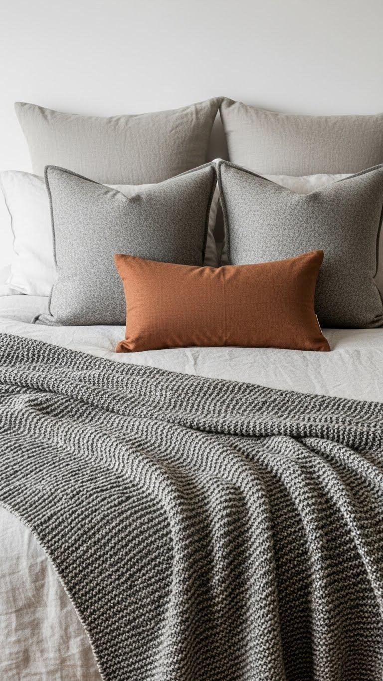Layer in a tactile throw-and-cushion mix to transform your bed into a cozy, curated bedscape: choose a heavyweight knit or boucle throw folded at the foot, then stack cushions in varying sizes—large linen Euro shams, medium wool pillows, and a small rust or clay-hued lumbar for contrast.