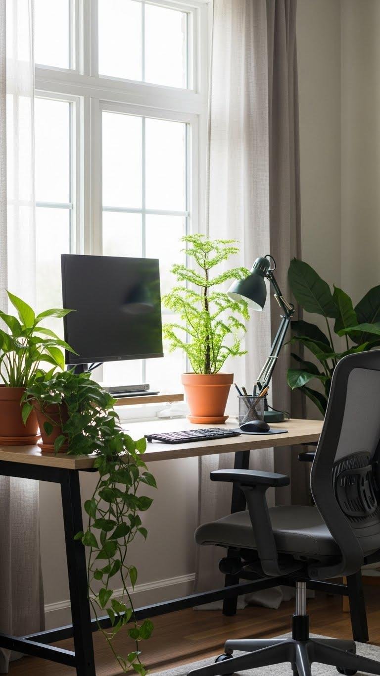 You’ll boost plant productivity and mood with cascading pothos, a sculptural fern, and terracotta pots. Prioritize sunlit ergonomics: angled monitor, adjustable chair, and light-filtering curtains so you stay free, comfortable, and productive.