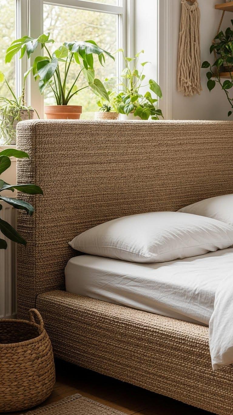 After a sunlit plant corner softens the room, an artisan-crafted textured bedhead anchors the bed with tactile warmth and handmade character. You choose a handcrafted headboard in natural fibers or woven wood, pairing textured upholstery for depth and durability. Mount it low to keep sightlines open, add simple linens, and let the piece be the room’s quiet statement — effortless, lived-in, free.
