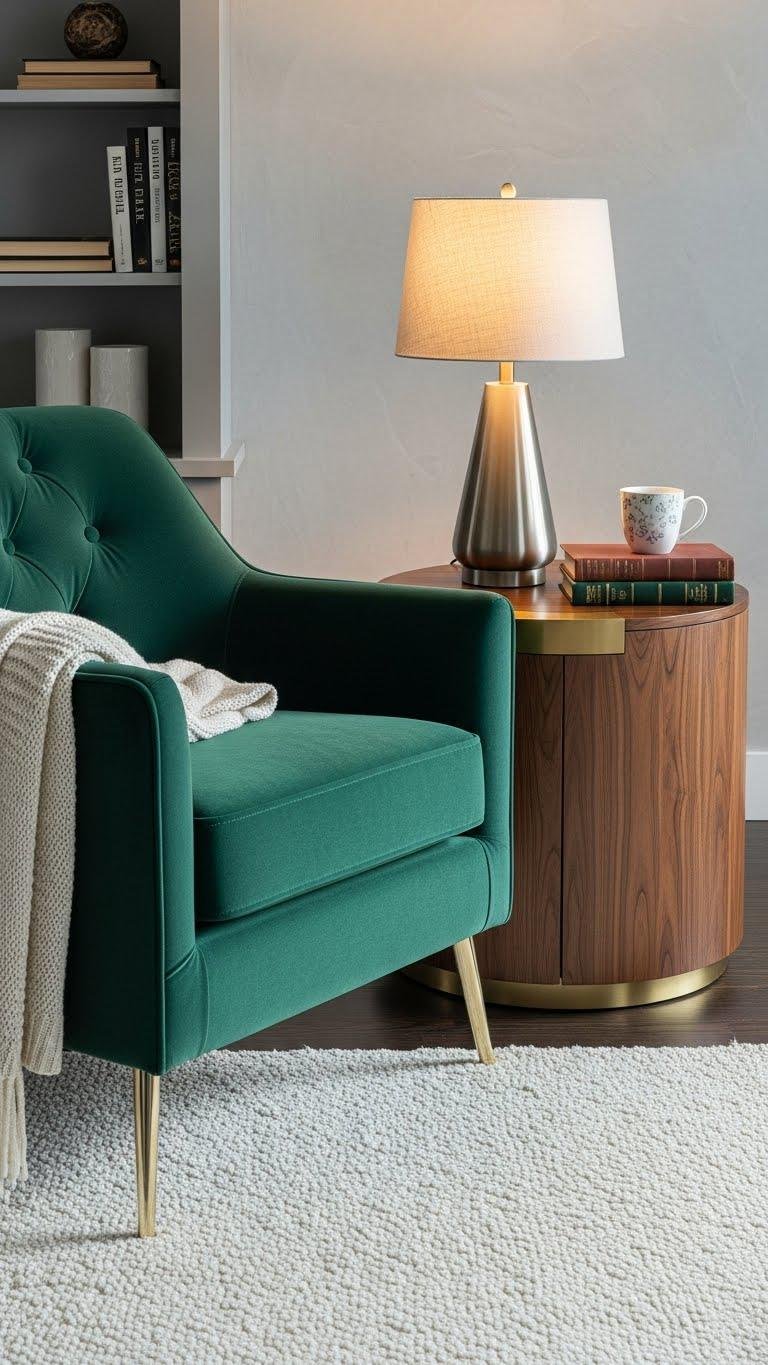 Shift your gaze from the tiny curios to a plush velvet accent chair, and you’ll find a cozy retreat that anchors the room.