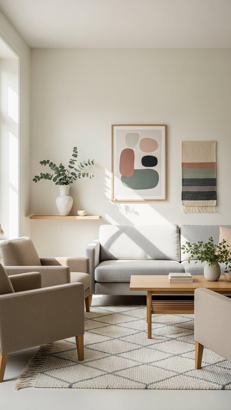 If you want a calm, neutral Scandinavian space, start with a soft palette of warm whites, pale grays, and muted beiges to let light feel plentiful and gentle.