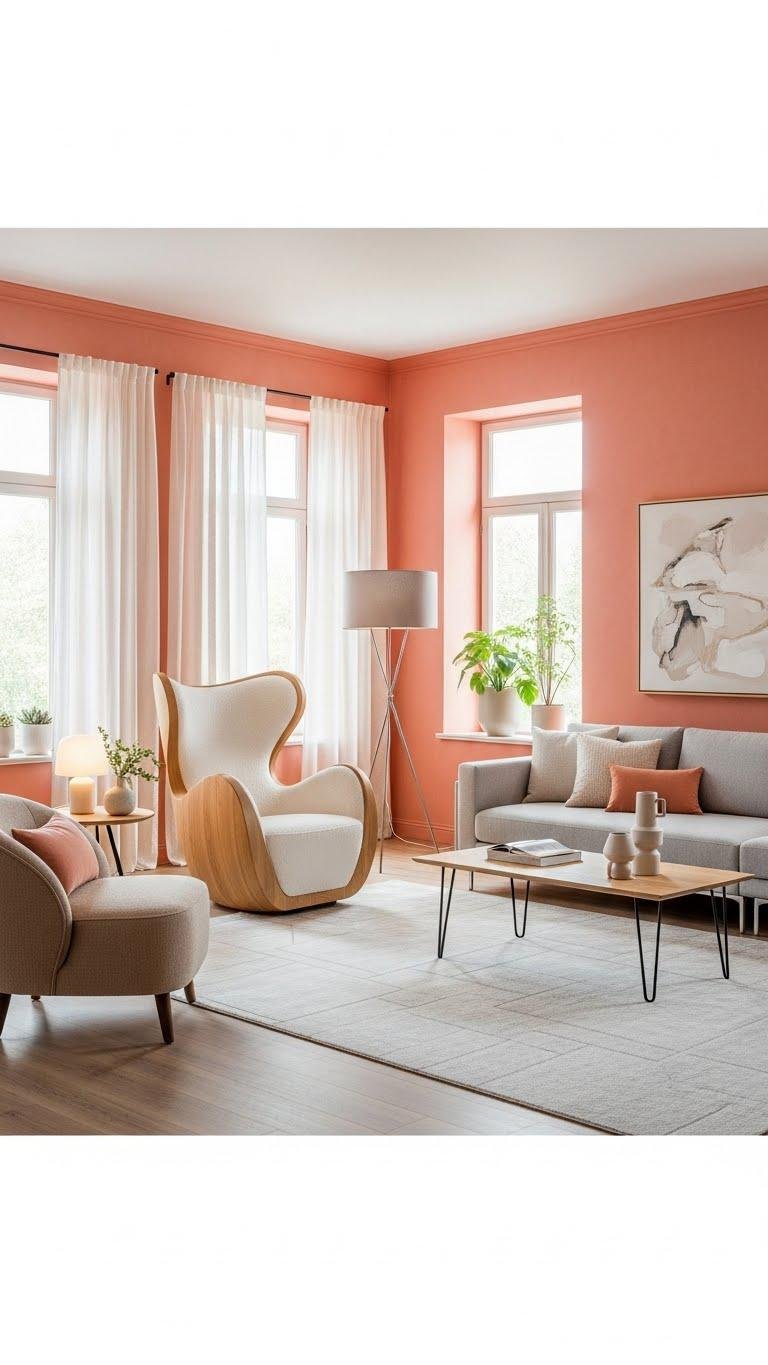 Soft coral’s gentle warmth sets the mood, and pairing it with sculptural furniture gives the room confident shape without overwhelming that calm.