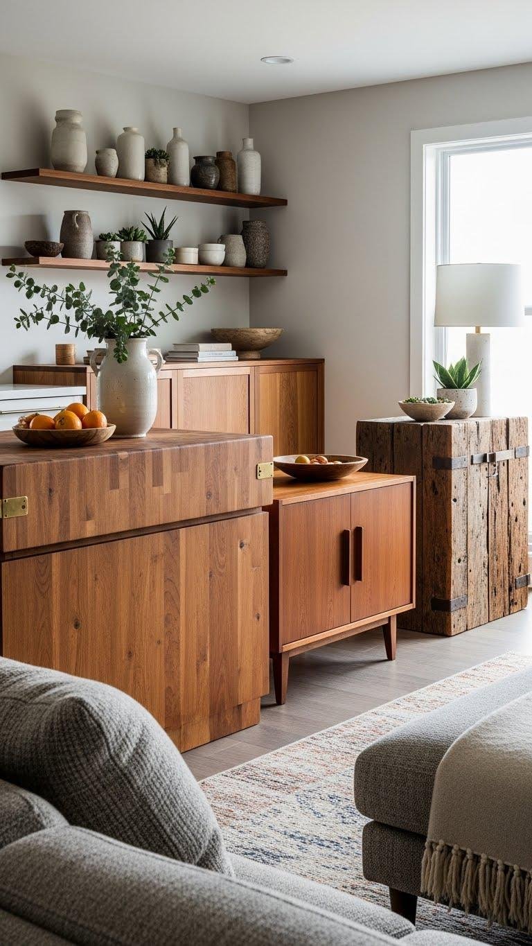 A warm woodsideboard or butcher-block console can instantly ground a room, giving you a practical focal point that’s both beautiful and useful. Choose a butcher block island edge, a sleek midcentury sideboard, or a rugged reclaimed wood piece to anchor living or dining spaces.